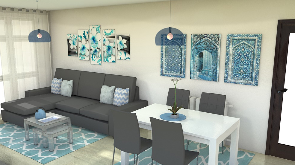 La verdad es que por una vez he contado con un espacio bastante amplio que siempre es algo de agradecer ya que siempre se me pone como reto diseñar espacios minúsculos. Además mi amiga me dió rienda suelta a diseñar lo que yo quisiese. Simplemente me puso como requisito que la cocina fuese en madera, alegre como es ella y que emplease los colores azul y verde, que es un poco los que ya se están empleando en la actualidad y con los que se siente bastante cómoda.